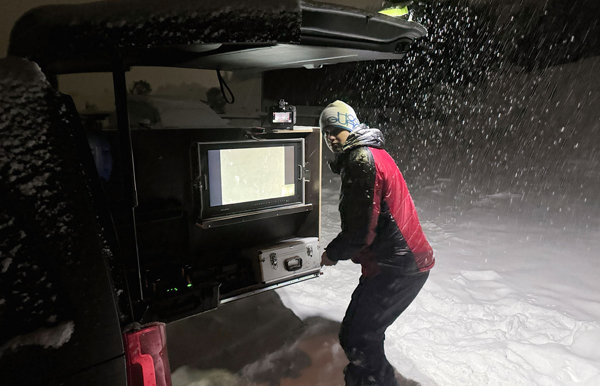 Optimale Sicht bei Nacht: Die Kombination aus Wärmebildkamera und Hochleistungsscheinwerfer ermöglicht eine schnelle Identifikation von Personen oder Tieren.