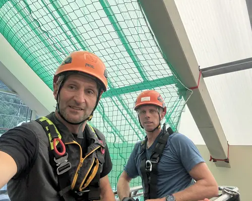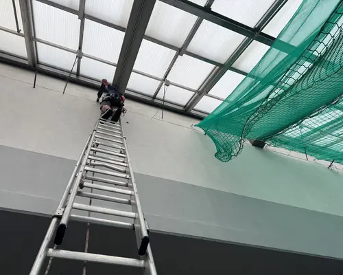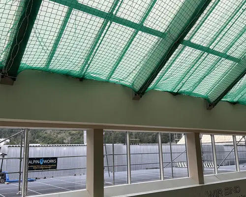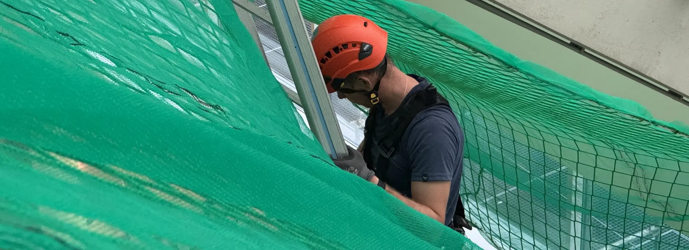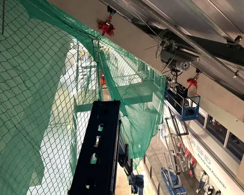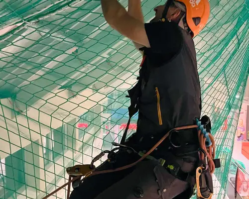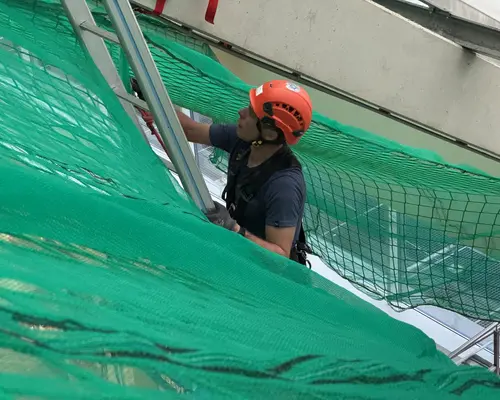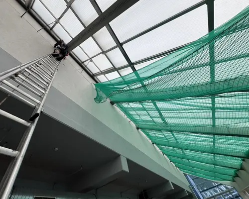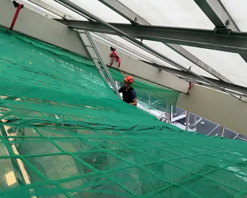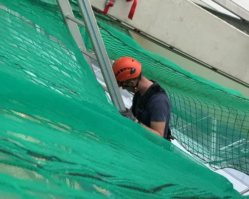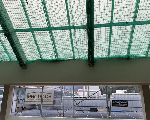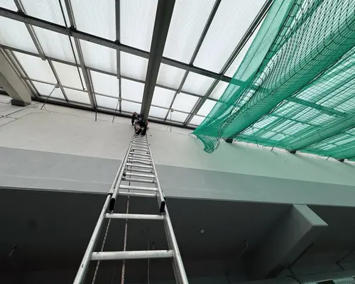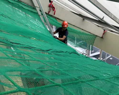 Die Montage erfolgte durch unser geschultes Fachpersonal mit moderner persönlicher Schutzausrüstung. Die Netze wurden an der Tragkonstruktion befestigt, lückenlos verlegt und nach den geltenden Sicherheitsstandards geprüft.